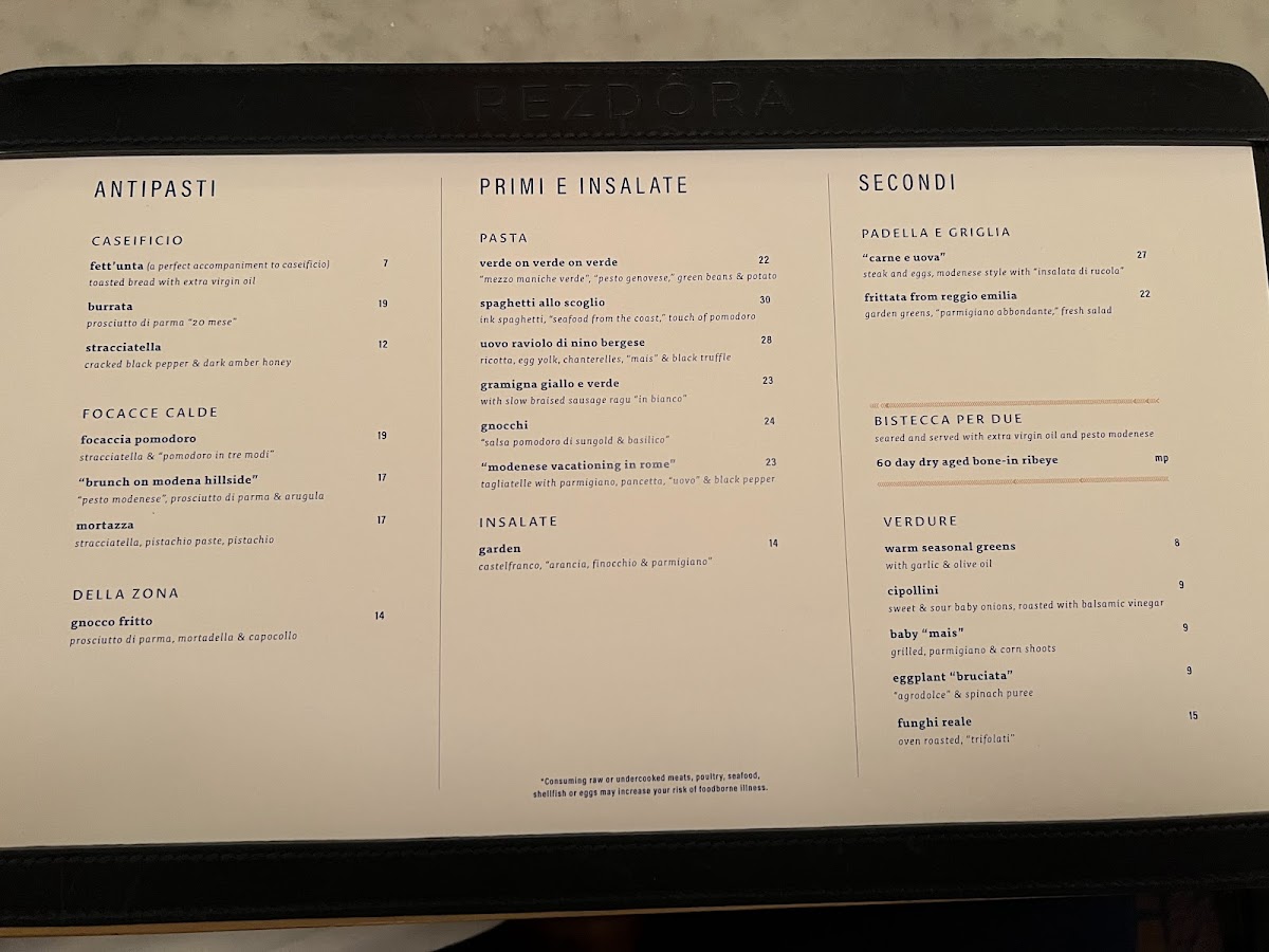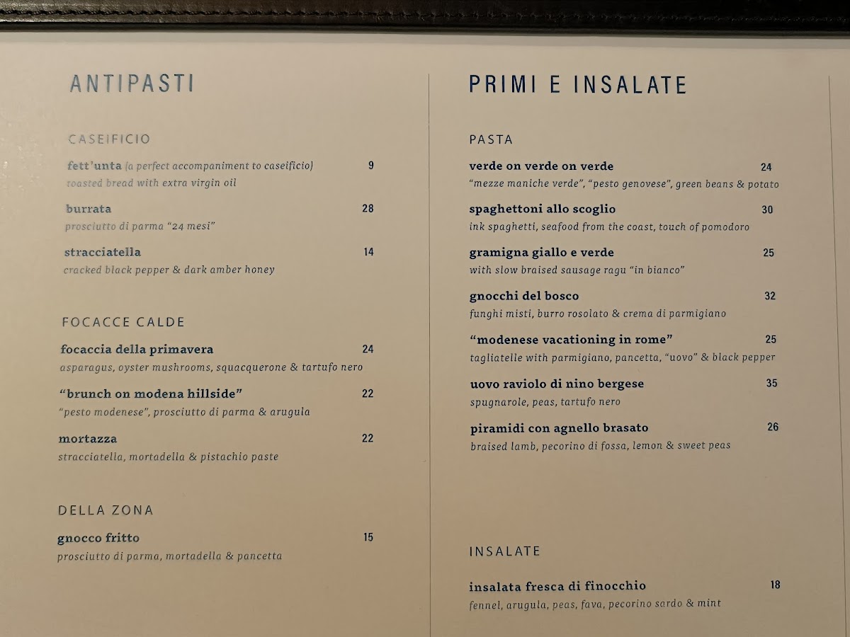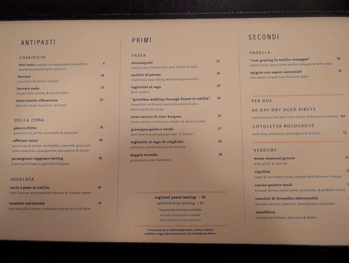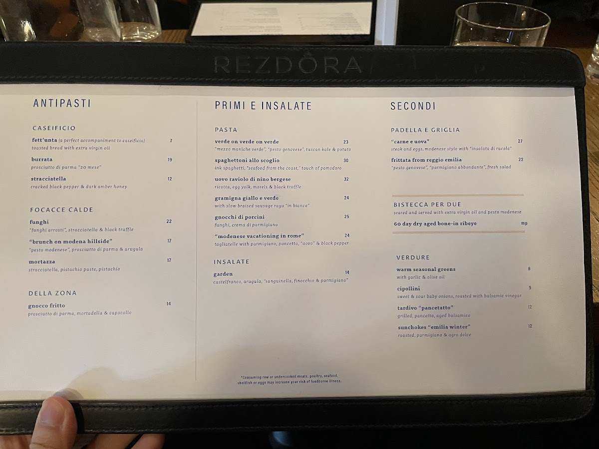 Excellent execution on all items. Very authentic Emilia Romagna food! The menu is meant to be ordered the Italian way - starting with the antipasti then primi then secondi. If you just order a pasta you will be disappointed. We started with the mozzarella di bufala DOP (8/10) and garlic bread (8.5/10), gnocco fritto (really amazing) (9/10) and worked our way to two primi pastas - gramigna giallo e verde (8/10) and also tried the grandma walking through the forest with Emilia ( creative and well crafted but wasn’t my flavor profile very creamy and heavy 6/10) and ended with cow grazing in Emilia romagna (9/10) and the black bass (felt over cooked and too greasy /salty 4/10) and the sunchoke millefoglie (8/10). We were very full by the end. Could’ve skipped out on one secondi - prob shared the steak between the two of us and that would have been perfect. Very lively for a Monday night crowd even at 10pm! Would come back again with friends. Came back for brunch with a friend! Delicious as always. Shared the straciatella and beans/ramps and we each had the gramigna. So delicious. Having actually visited the Emilia Romana region, I will say Rezdora captures the essence of the food there very well.