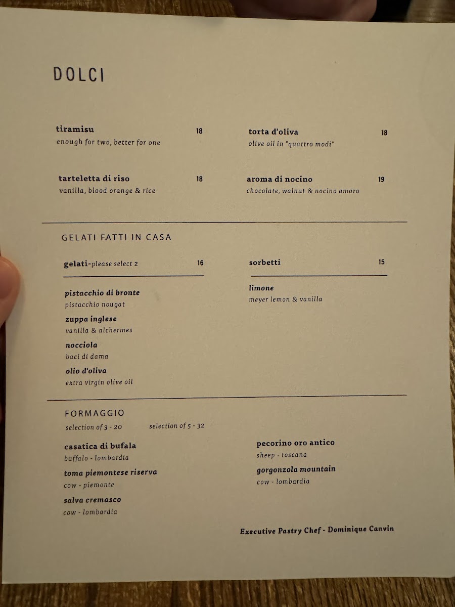 A wonderful pasta forward restaurant that's one of the better ones in nyc. Had the vegetarian pasta tasting menu. All five courses were delicious. The gnocchi in a tomato based sauce was my favorite. Also a truffle gnuddi was amazing. The cacio E peppe salad was also excellent. One of the best tiramisu I've ever had and delicious Gelato. Service is outstanding.